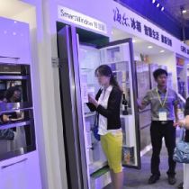 冰箱门自动变透明 电博会上用户与与冰箱玩互动